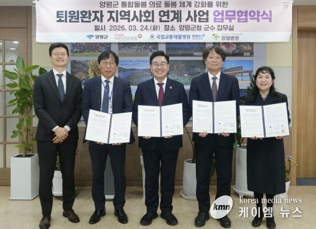 (케이엠뉴스) 양평군은 지난 24일 군수실에서 국민건강보험공단 양평지사, 국립교통재활병원, 양평병원과 ‘퇴원환자 지역사회 연계 사업’ 추진을 위한 업무협약을 체결하고 의료·돌봄 통합체계 구축에 나섰다고 밝혔다.