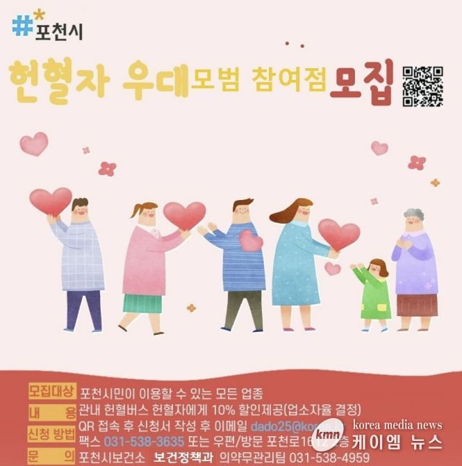 (케이엠뉴스) 포천시는 지역 상인과 함께 관내 헌혈 참여를 늘리고 지역상권 활성화를 도모하기 위해 ‘헌혈자 우대 모범참여점’을 모집한다.