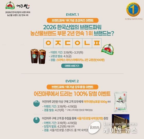 먼저, 어진마루몰 초성퀴즈 이벤트는 ‘2026 한국산업의 브랜드파워 농산물 브랜드 부문 2년 연속 1위 브랜드는?’이라는 질문에 대한 정답을 맞히는 방식으로 진행된다. 이벤트 기간은 3월 19일부터 3월 31일까지이며, 참여자 중 추첨을 통해 스타벅스 아이스 아메리카노 2잔 교환권(100명) 이 제공된다. 교환권은 4월 3일 일괄 발송될 예정이다.