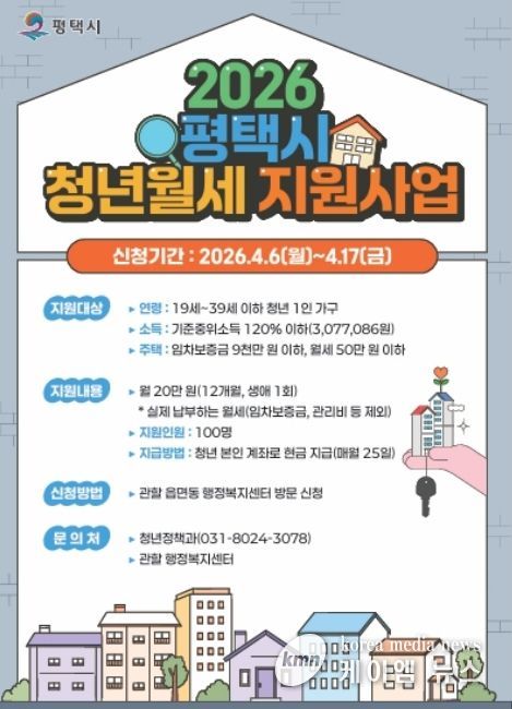 (케이엠뉴스) 평택시는 관내 청년의 주거비 부담 완화와 사회진입 지원을 위해 ‘평택시 청년 월세 지원’사업 신규 대상자를 모집한다.