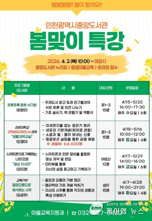 (케이엠뉴스) 인천광역시교육청중앙도서관은 4월부터 지역주민의 배움과 여가를 지원하기 위하여, 다양한 연령층을 대상으로 ‘봄맞이 특강’을 운영한다.