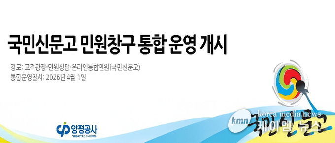(케이엠뉴스) 양평공사는 군민 중심의 민원 서비스를 강화하고 민원 처리의 신속성과 효율성을 높이기 위해 국민권익위원회가 운영하는 ‘국민신문고’ 시스템을 도입해, 4월 1일부터 전 시설을 대상으로 통합 민원창구 운영을 전면 시행한다고 밝혔다.