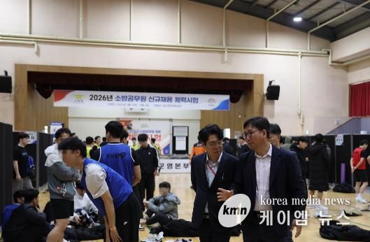 (케이엠뉴스) 성호선 충남소방본부장은 1일 예산군 삽교읍 국민체육센터에서 진행 중인 ‘2026년도 소방공무원 신규 채용 체력시험’ 현장을 찾아 응시생들과 시험 감독관 등을 격려했다.