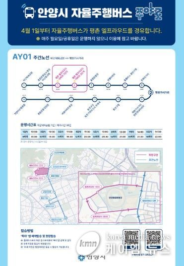 운행 노선도 일부 연장됐다. ‘주야로’는 평촌엘프라우드 아파트를 새롭게 경유해 1단지와 2단지에 각각 정차한다. 상행선(비산체육공원→학원가사거리 방면)은 종합운동장수영장.비산동교회 정류장을 거쳐 평촌엘프라우드 아파트 1, 2단지에 각각 추가 정차한다. 반면 하행선(학원가사거리→비산동 종점)은 기존과 동일하게 해당 아파트를 경유하지 않는다.