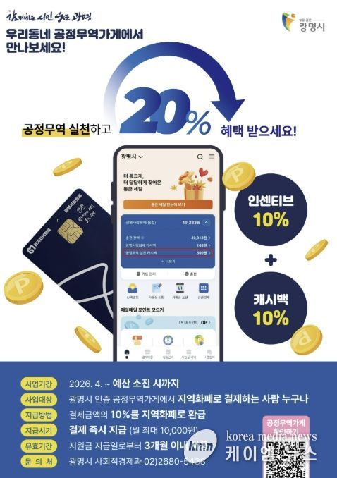 광명사랑화폐 충전 시 제공하는 10% 인센티브까지 더하면 시민이 실제로 누리는 혜택은 최대 20%에 달한다.