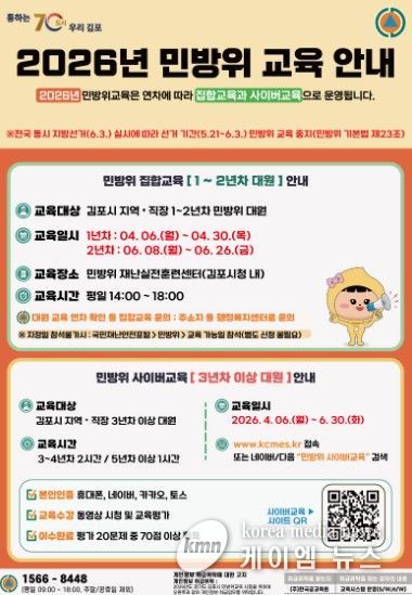 (케이엠뉴스) 김포시는 2026년 상반기 민방위 대원의 안보 의식 고취와 재난 대응 역량 강화를 위해 ‘2026년 상반기 민방위 교육’을 본격적으로 시행한다고 밝혔다. 이번 교육은 민방위 대원의 연차에 따라 집합교육과 사이버교육으로 구분되어 진행되며, 특히 올해는 연차별 일정을 세분화해 운영한다.