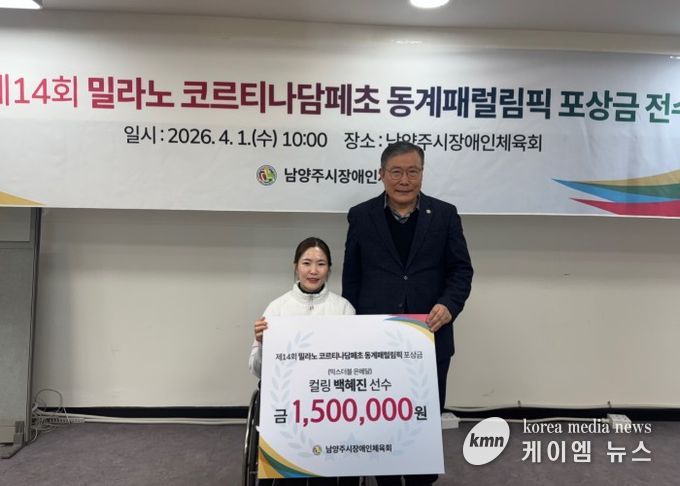 (케이엠뉴스) 남양주시는 지난 1일 남양주시장애인체육회가 제14회 밀라노-코르티나담페초 동계패럴림픽 휠체어컬링 믹스더블 종목 은메달리스트 백혜진 선수에게 포상금을 전달하고 성과를 격려했다고 2일 밝혔다.