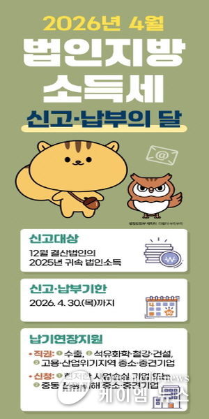 (케이엠뉴스) 안성시는 12월 결산법인의 2025년 귀속 법인소득에 대한 ‘법인지방소득세 집중신고기간’을 4월 1일(수)부터 4월 30일(목)까지 운영한다고 밝혔다.
