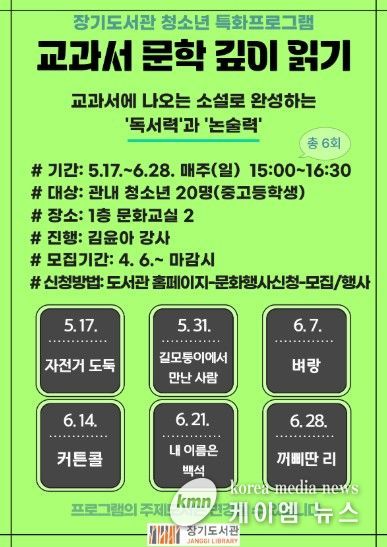 (케이엠뉴스) 김포시 장기도서관은 청소년의 독서력과 논술력 향상을 위해 '교과서 문학 깊이 읽기' 프로그램을 오는 5월 17일부터 6월 28일까지 진행한다.