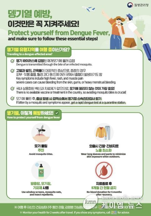 보건소는 해외 방문 후 2주 이내 뎅기열 의심 증상(발열, 두통, 발진 등)이 있는 경우 주소지와 관계없이 누구나 무료 확진 검사를 받을 수 있다고 설명했다.