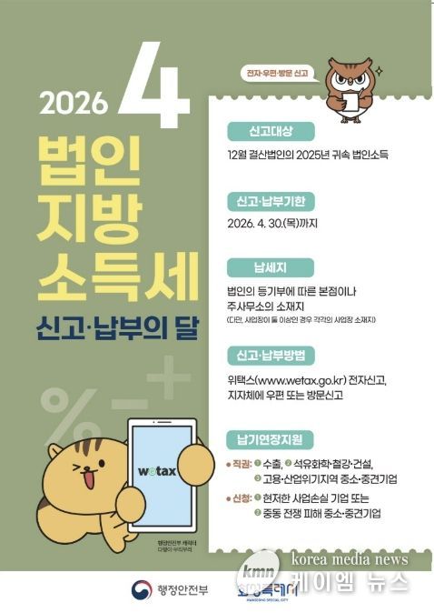 (케이엠뉴스) 화성특례시가 2025년 귀속 ‘법인지방소득세 집중 신고·납부 기간’을 오는 4월 30일까지 운영한다고 밝혔다.