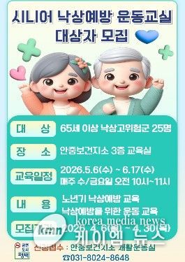 (케이엠뉴스) 평택시 안중보건지소에서는 65세 이상 근력저하자(허약 노인) 및 낙상 고위험군인 노년층 지역주민을 대상으로 ‘시니어 낙상예방 운동교실’을 오는 5월 6일부터 6월 17일까지 매주 수·금요일 10:00~11:00 총 12회에 걸쳐 진행한다.