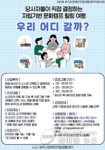 (케이엠뉴스) 양주시장애인자립생활센터에서는 장애인 당사자가 직접 선택하고 결정하는 자립 기반 힐링 여행을 목적으로 하는 지역 장애인 문화캠프 [우리 어디 갈까?] 참가자를 모집한다.