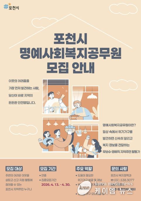 (케이엠뉴스) 포천시는 복지사각지대 해소와 위기이웃 발굴을 위해 ‘명예사회복지공무원’을 오는 30일까지 집중 모집한다.