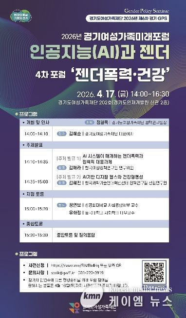 (케이엠뉴스) 경기도여성가족재단은 오는 17일 재단 회의실에서 ‘인공지능과 젠더폭력·건강’을 주제로 4차 경기여성가족미래포럼을 개최한다. 3월부터 5월까지 총 5차례 진행하는 경기여성가족미래포럼 중 이번이 4회차다.