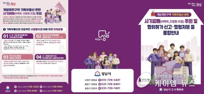 (케이엠뉴스) 성남시는 최근 개발이 불가능하거나 제한적인 개발제한구역(그린벨트) 내 토지를 곧 해제될 것처럼 속여 고가에 판매하는 이른바 ‘기획부동산’ 사기가 증가함에 따라 시민 주의를 당부하고, 안내문을 제작·배부한다고 밝혔다.