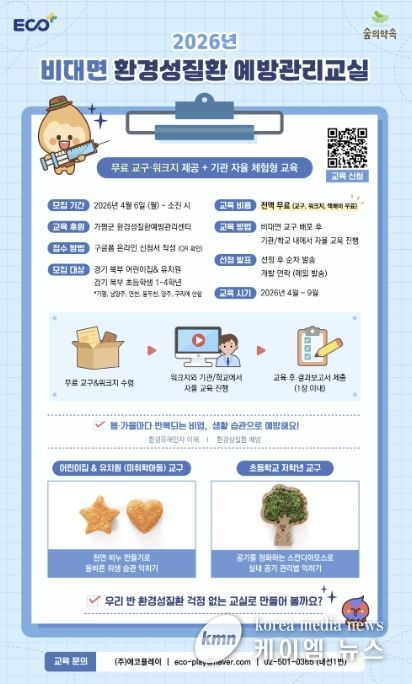 (케이엠뉴스) 가평군 환경성질환예방관리센터 ‘숲의 약속’이 어린이들의 건강한 생활 습관 형성을 돕기 위해 ‘2026년 비대면 환경성질환 예방관리교실’ 참여 기관을 모집한다.