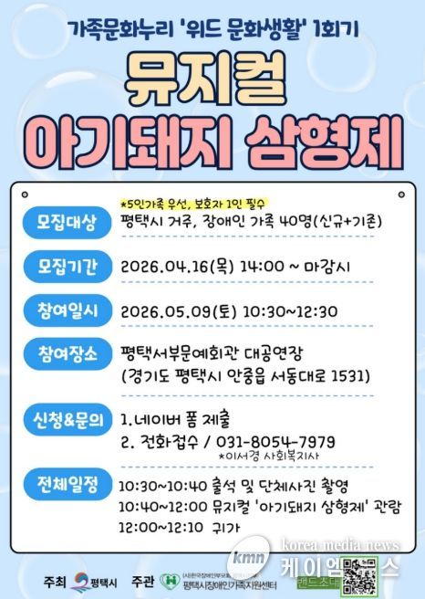 이번 1회기는 오는 5월 9일 오전 10시 30분부터 12시까지 평택서부문예회관에서 진행되며, 가족뮤지컬 ‘아기돼지 삼형제’관람 프로그램으로 운영된다. 공연 관람을 통해 가족 간 상호작용을 촉진하고 긍정적인 정서 경험을 통한 유대감 향상에 기여할 수 있을 것으로 기대된다.
