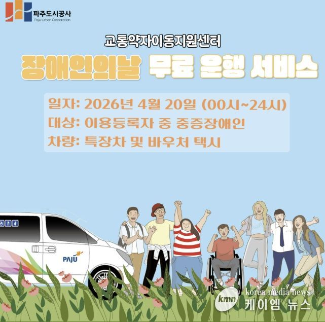 (케이엠뉴스) 파주도시공사 교통약자이동지원센터에서는 오는 4월 20일 장애인의 날을 맞아 교통약자를 위한 무료 운행 서비스를 실시한다.