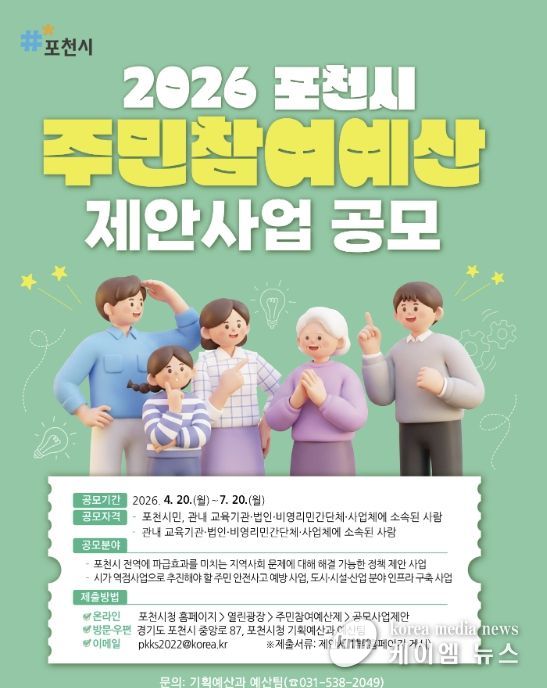 (케이엠뉴스) 포천시가 4월 20일부터 오는 7월 20일까지 2027년도 예산편성을 위한 주민참여예산 공모제안사업을 접수하고 있다.