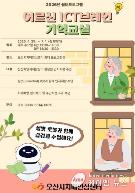 (케이엠뉴스) 오산시치매안심센터는 오는 4월 29일부터 경증 치매환자를 위한 쉼터 프로그램 ‘ICT 브레인 기억 교실’을 운영한다고 밝혔다.