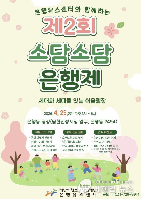 (케이엠뉴스) 성남시청소년청년재단 은행유스센터는 오는 4월 25일 오후 1시부터 5시까지 은행동 광장에서 청소년과 지역 주민이 함께하는 ‘제2회 소담소담 은행제’를 개최한다.