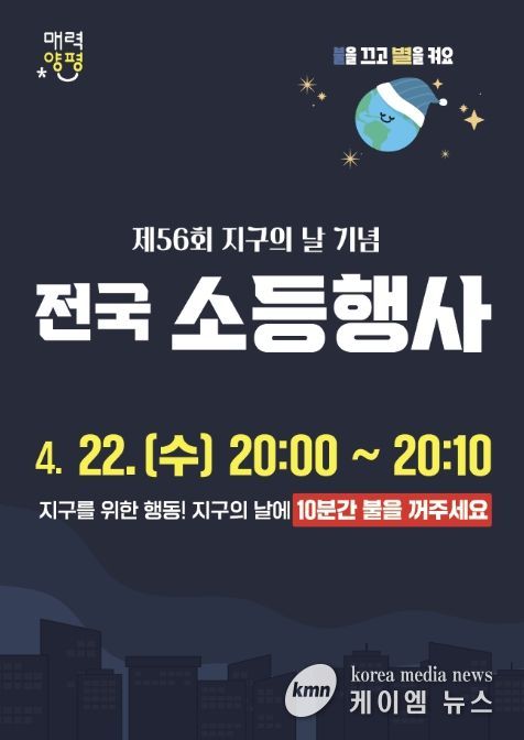 특히 지구의 날 당일인 22일 오후 8시부터 10분간 전 군민이 참여하는 ‘소등 행사’가 진행된다. 양평군청을 비롯한 관내 공공기관은 전면 소등에 참여하고, 공동주택과 일반 가정에서도 자율적으로 동참할 수 있도록 할 계획이다.
