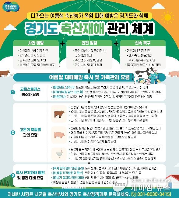 신종광 축산정책과장은 “기후 위기로 폭염이 일상화된 만큼 경기도는 농가와 협력해 선제적 방어 체계를 유지할 것”이라며 “면역증강제 지원과 재해보험 등 가용자원을 총동원해 축산농가가 안심하고 생업에 종사할 수 있도록 최선을 다하겠다”고 말했다.