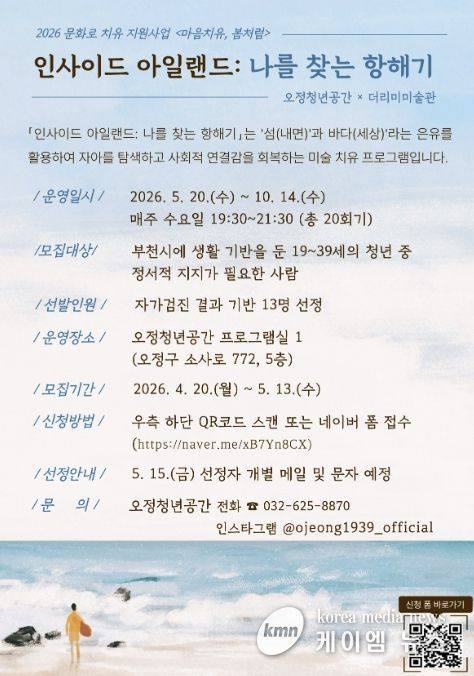 (케이엠뉴스) 부천시는 오정청년공간에서 정서적 고립감을 겪는 청년을 위한 미술 치유 프로그램 ‘인사이드 아일랜드: 나를 찾는 항해기’ 참여자를 5월 13일까지 모집한다.
