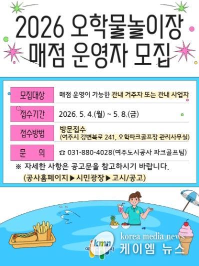 (케이엠뉴스) 여주도시공사는 2026년 오학물놀이장 운영을 앞두고 이용객 편의 제공을 위한 매점 운영자를 공개 모집한다고 밝혔다.