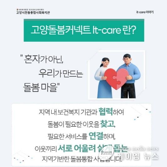 (케이엠뉴스) 고양시흰돌종합사회복지관은 일상 속 돌봄을 실현하기 위해 보건-복지가 연계된 통합돌봄 인프라 구축 프로젝트 ‘고양돌봄커넥트 It-care’ 사업을 추진한다고 22일 밝혔다.
