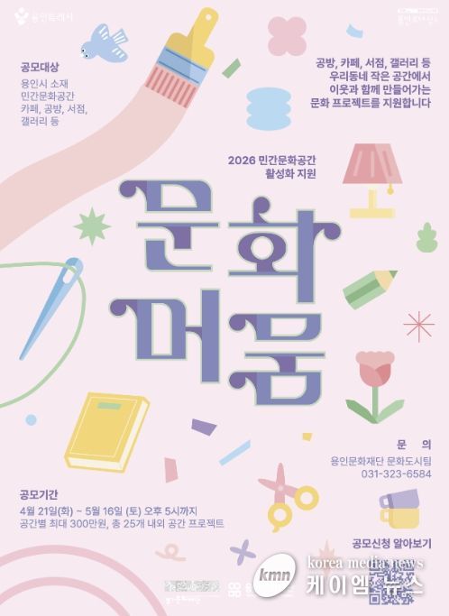 (케이엠뉴스) 용인문화재단은 오는 5월 16일까지 ‘민간문화공간 활성화 지원사업 '문화머뭄'’의 참여 공간을 모집한다고 밝혔다. 지난해 25개소 공간에서 203회의 프로그램을 운영하며 2,101명의 시민 참여를 이끌어낸 ‘문화머뭄’ 사업은 올해 재단 자체 재원을 매칭하여 총 25개소의 민간문화공간을 선정하고, 공간별 최대 300만 원까지 프로젝트 운영비를 지원할 예정이다.