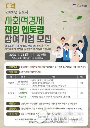 (케이엠뉴스) 김포시는 협동조합, 사회적기업, 마을기업 등 사회적경제기업 진입을 지원하기 위해 ‘2026년 김포시 사회적경제 진입 멘토링’ 참여기업을 오는 11월 30일까지 수시 모집한다.