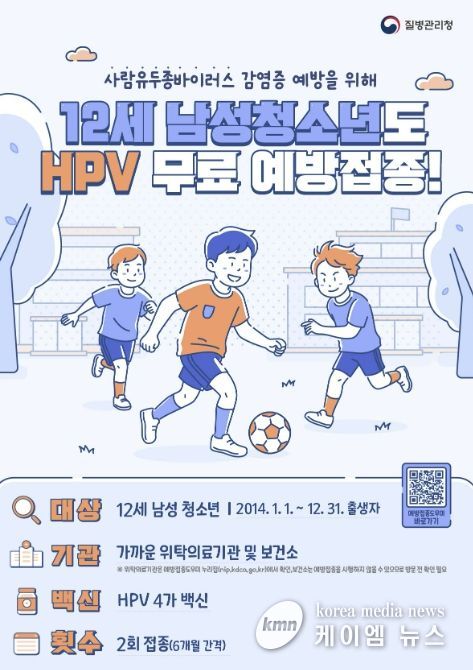 (케이엠뉴스) 안산시는 질병관리청 방침에 따라 내달 6일부터 사람유두종바이러스(HPV) 국가예방접종 지원 대상을 12세 남성 청소년까지 확대한다고 24일 밝혔다.