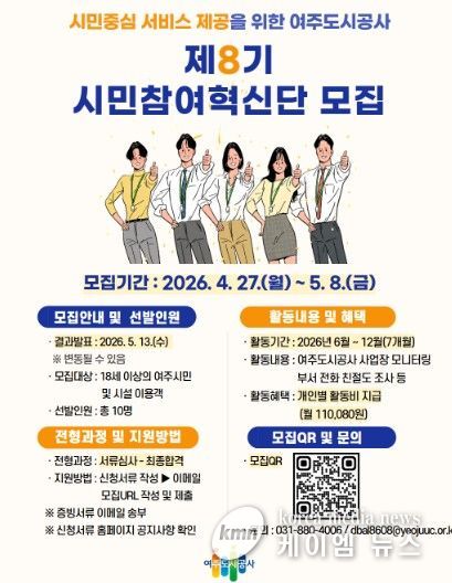 (케이엠뉴스) 여주도시공사는 여주시민 및 이용 고객들의 다양한 의견을 수렴하고, 함께 문제를 해결하는 시민참여형 활동의 일환인 ‘시민참여혁신단 8기’를 모집한다고 밝혔다.