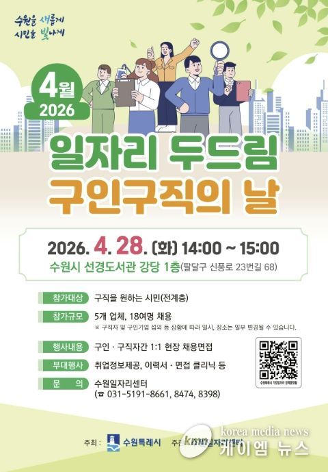 (케이엠뉴스) 수원특례시는 4월 28일 오후 2시부터 3시까지 선경도서관 강당에서 ‘4월 일자리 두드림 구인·구직의 날’을 개최한다.