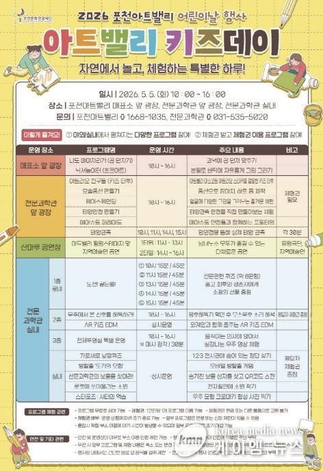(케이엠뉴스) 포천문화관광재단이 운영하는 포천아트밸리는 오는 5월 5일 어린이날을 맞아 어린이와 가족을 위한 체험형 문화행사 ‘아트밸리 키즈데이’를 개최한다.