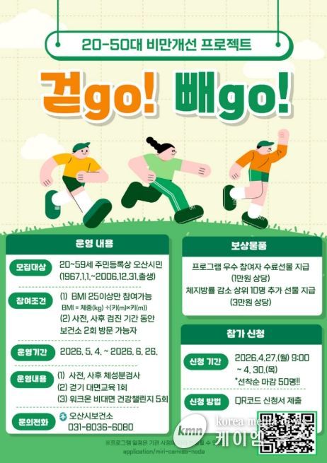 (케이엠뉴스) 오산시보건소는 최근 젊은 층의 비만율 증가에 대응해 체질량지수(BMI) 25kg/㎡ 이상인 20~50대 오산시민을 대상으로 걷기 기반 비만 개선 프로그램 ‘걷GO 빼GO’를 운영한다고 밝혔다.