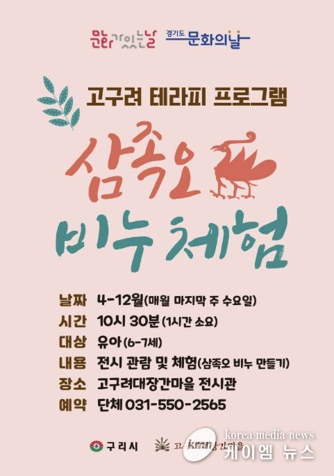 (케이엠뉴스) 구리시는 4월부터 고구려대장간마을에서 매월 마지막 주 수요일 ‘문화가 있는 날’을 맞아 ‘삼족오 비누 체험! 고구려 치료 프로그램’을 운영한다고 밝혔다.