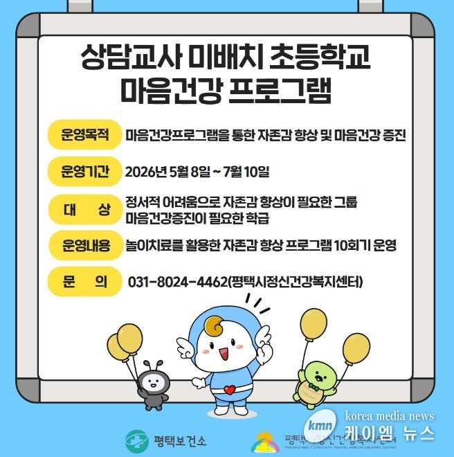 (케이엠뉴스) 평택시는 상담교사가 배치되지 않은 초등학교 학생들의 정신건강 지원을 위해 ‘마음건강 프로그램’을 운영한다고 밝혔다.