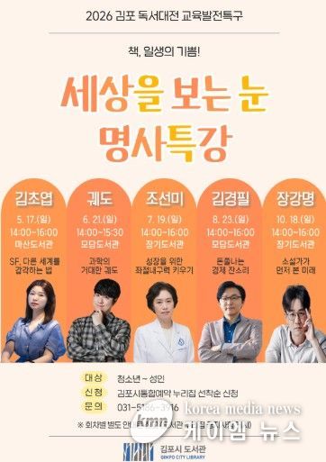 (케이엠뉴스) 김포시 도서관은 2026 김포 독서대전 교육발전특구 사업으로 '세상을 보는 눈, 명사특강'을 오는 5월 17일부터 10월 18일까지 5회에 걸쳐 관내 도서관 3곳에서 진행한다.