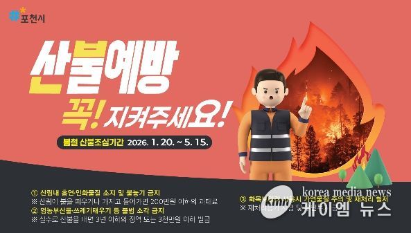 (케이엠뉴스) 포천시는 봄철 건조한 날씨와 강풍으로 산불 발생 위험이 높아짐에 따라 산불조심기간이 종료되는 오는 5월 15일까지 경계를 늦추지 않고 산불예방 활동에 총력을 기울이고 있다.