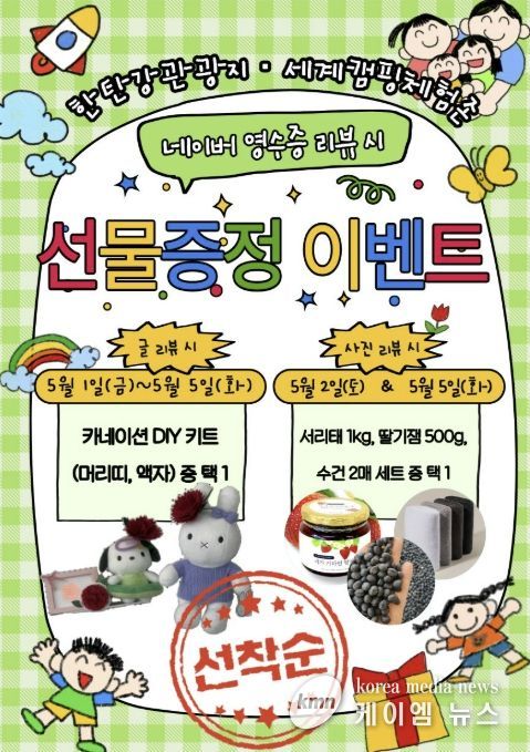 (케이엠뉴스) 연천군시설관리공단은 가정의 달을 맞이해 오는 5월 1일부터 5월 5일 내 한탄강관광지 오토캠핑장 및 세계캠핑체험존을 방문하는 가족 단위 관광객을 위한 참여형 이벤트를 운영한다.