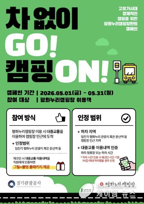 ‘차 없이 GO, 캠핑 ON’는 대중교통을 이용해 캠핑장을 방문하는 고객에게 혜택을 제공하는 캠페인이다. 대중교통 이용 내역을 인증하면 참여할 수 있으며, 참여 고객에게는 그릴과 불멍을 동시에 즐길 수 있는 ‘그릴+불멍 풀패키지’(48,000원 상당) 상품이 제공된다. 대중교통 이용 인정 범위는 문산역 또는 임진각 평화누리 관광지 일원 하차를 기준으로 하며, 이후 캠핑장까지는 도보 또는 택시 이용이 허용된다. 자세한 사항은 평화누리캠핑장 누리집을 통해 확인할 수 있다.