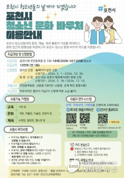 (케이엠뉴스) 포천시는 청소년의 문화 접근성을 높이고 다양한 체험 기회를 제공하기 위해 ‘포천시 청소년 문화 바우처 지원사업’을 본격 시행한다.