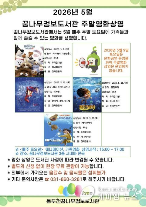 (케이엠뉴스) 동두천시 도서문화사업소 정보도서관에서는 오는 5월 매주 토요일 어린이와 가족을 위한 애니매이션 및 가족영화 4편을 상영한다고 밝혔다.
