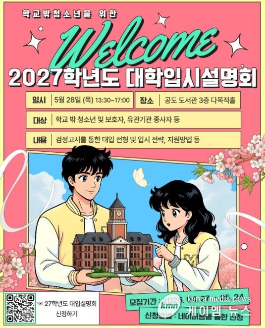 (케이엠뉴스) 안성시학교밖청소년지원센터는 학교 밖 청소년의 성공적인 진학을 돕기 위해 오는 5월 28일 오후 1시 30분부터 공도 도서관 다목적홀에서 ‘2027학년도 대학 입시 설명회’를 개최한다고 밝혔다.