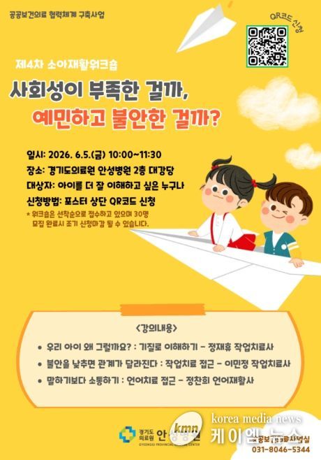 (케이엠뉴스) 평택권 지역책임의료기관인 경기도의료원 안성병원은 공공보건의료 협력체계 구축사업의 일환으로 아동의 발달과 정서적 특성을 이해하기 위한 '제4차 소아재활 워크숍'을 개최하고 참가자를 모집한다고 밝혔다. 이번 워크숍은 “사회성이 부족한 걸까, 예민하고 불안한 걸까?”라는 질문을 중심으로, 아동의 행동을 문제로만 보기보다 기질과 발달 특성으로 이해할 수 있도록 돕는 데 초점을 맞췄다.