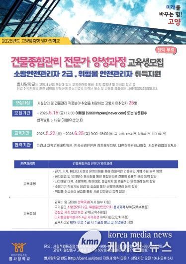 (케이엠뉴스) 고양특례시는 중장년과 청년 미취업자의 재취업을 지원하는 2026년 고양맞춤형 일자리학교의 일환으로, ‘건물종합관리 전문가 양성과정’에 참여할 교육생을 모집한다고 29일 밝혔다.