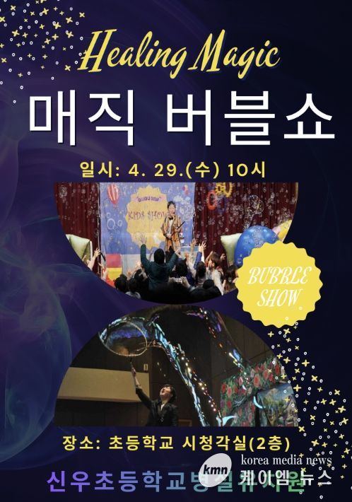 (케이엠뉴스) 신우초등학교병설유치원은 4월 29일 교내 시청각실에서 ‘힐링 매직버블쇼’ 공연을 개최했다고 밝혔다. 이번 공연은 유아들이 직접 참여하며 즐길 수 있는 체험형 프로그램으로 마련됐다.